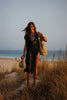 Este poncho negro de estilo bohemio es la prenda ideal para destacar con elegancia y frescura en los días de verano. Confeccionado en un tejido ligero y suave al tacto, presenta un diseño deshilachado artesanal que aporta movimiento y personalidad a cada paso. Su corte largo y fluido, adornado con flecos y tiras verticales, crea una silueta relajada perfecta para superponer sobre trajes de baño o conjuntos ligeros. Una pieza imprescindible para tus escapadas a la playa o tus looks festivaleros.
